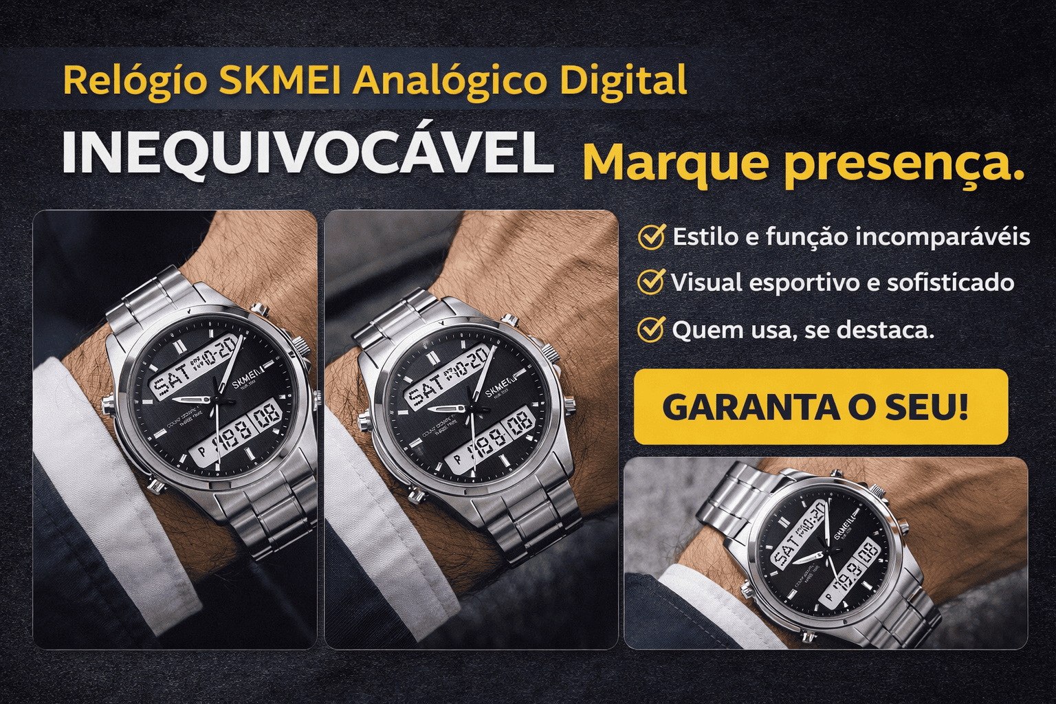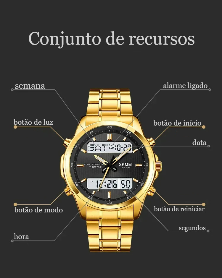 Criado para o homem que valoriza elegância e desempenho, ele combina design em aço premium com visor analógico + digital, entregando o equilíbrio perfeito entre tecnologia e estilo.